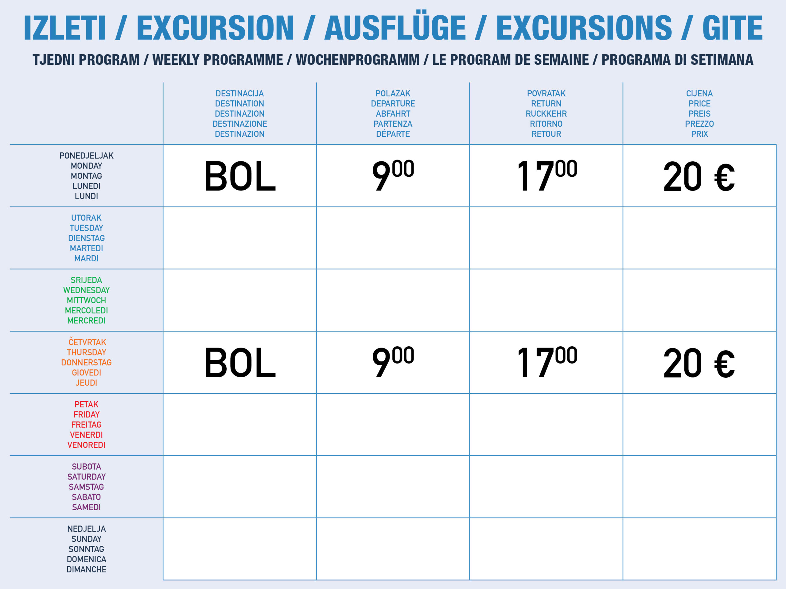 Jelsa – Bol s polaskom u 09.00h i povratkom u 17.00h.